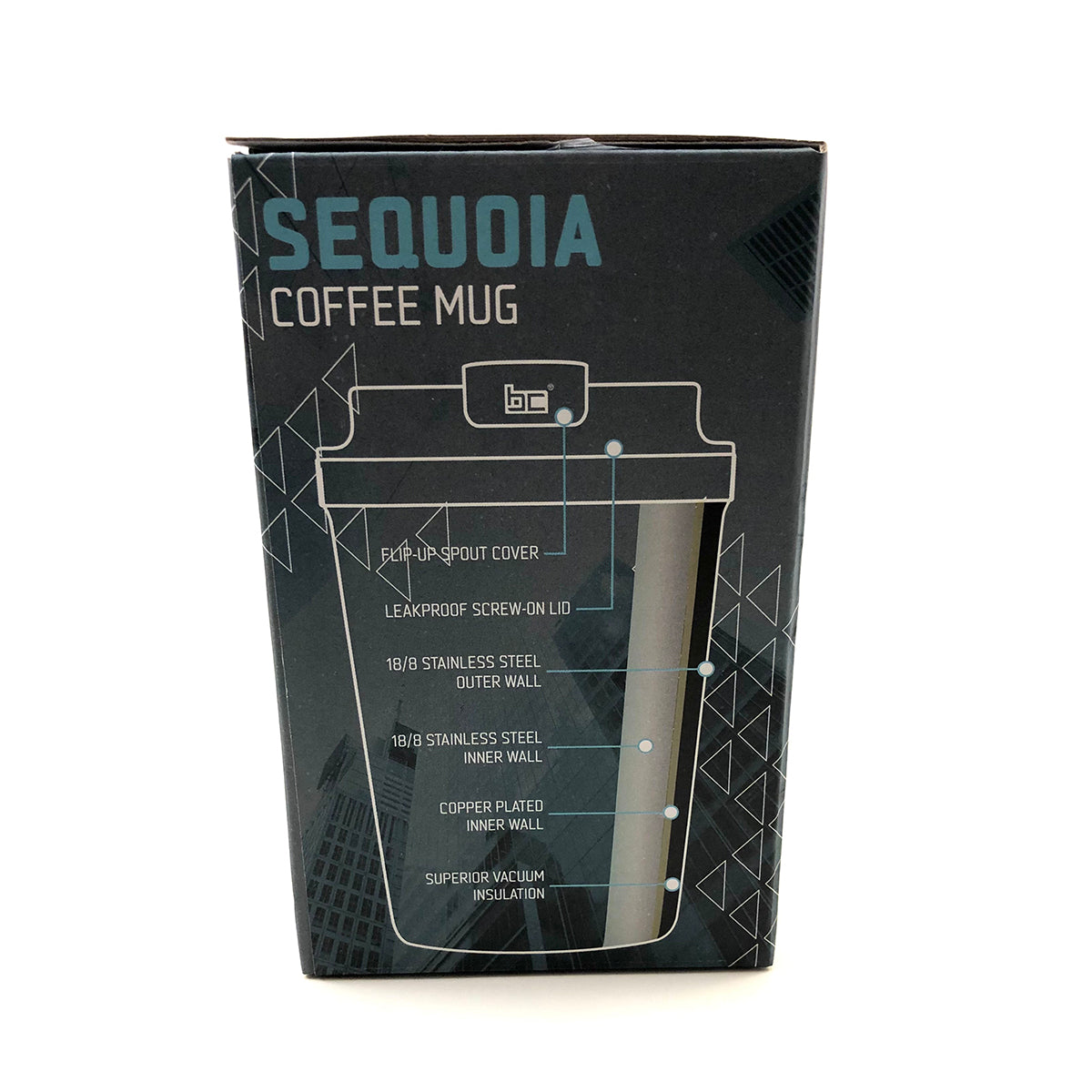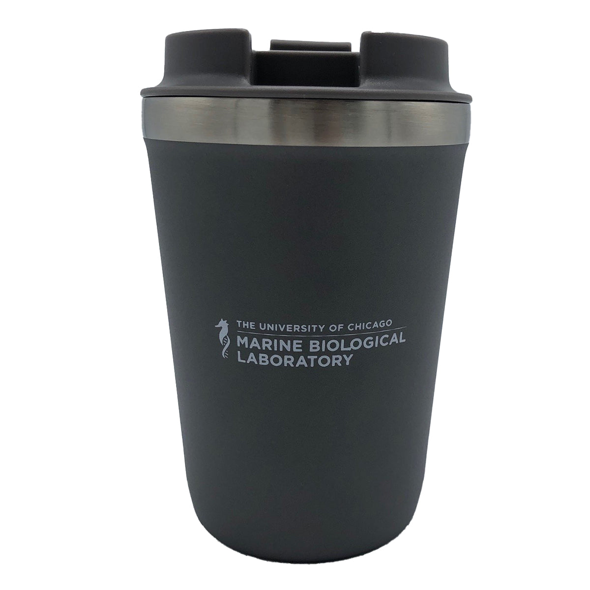 12 oz vacuum insulated double wall coffee mug with a flip up lid.