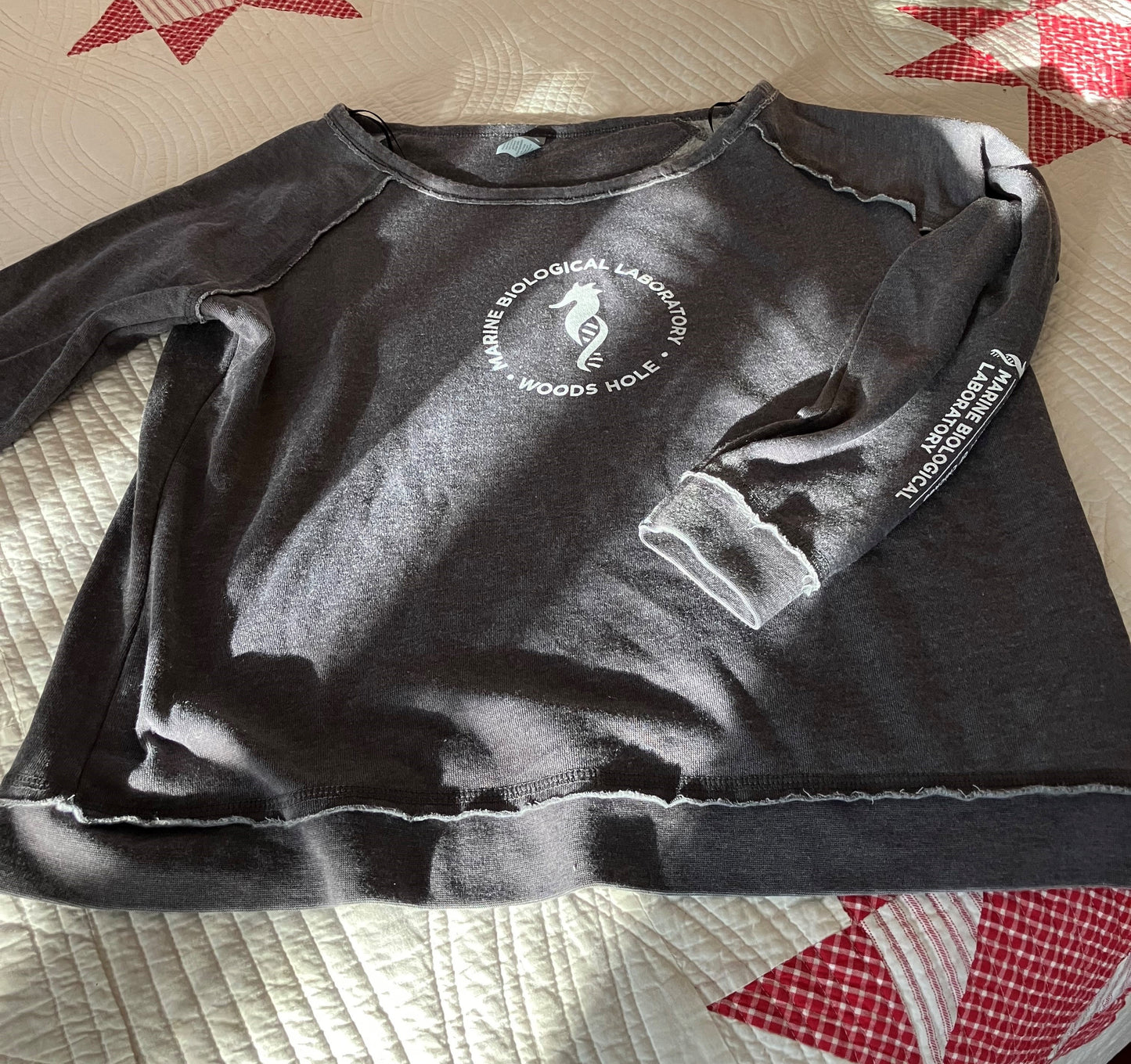 Soft vintage wash with exposed overlock stitching. Relaxed fit.